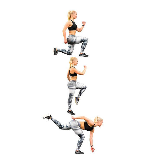 Принесите одну ногу назад в обратном выпаде. Подпрыгните, переключая ноги. Продолжайте одну минуту.