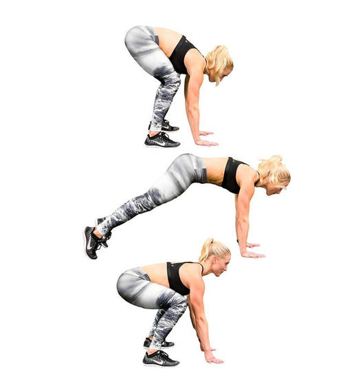 Начало в нижнем положении планки. Поставьте ноги шире, а затем прыжком ваши ноги вперед к животу.