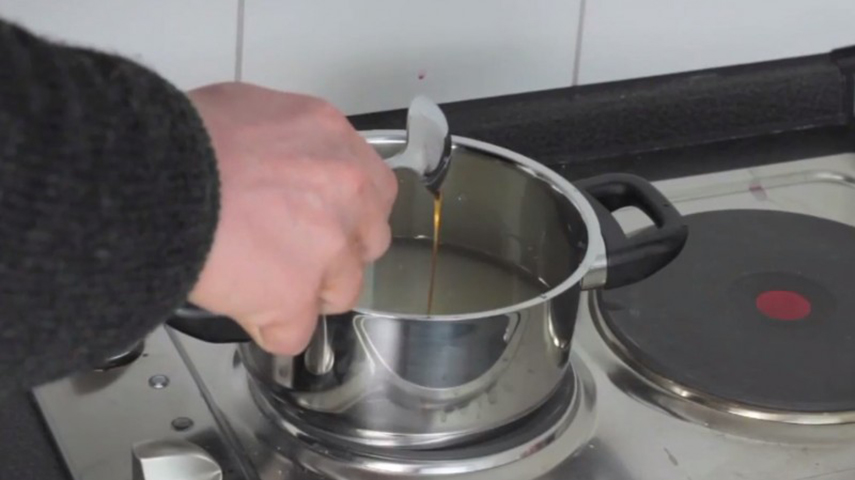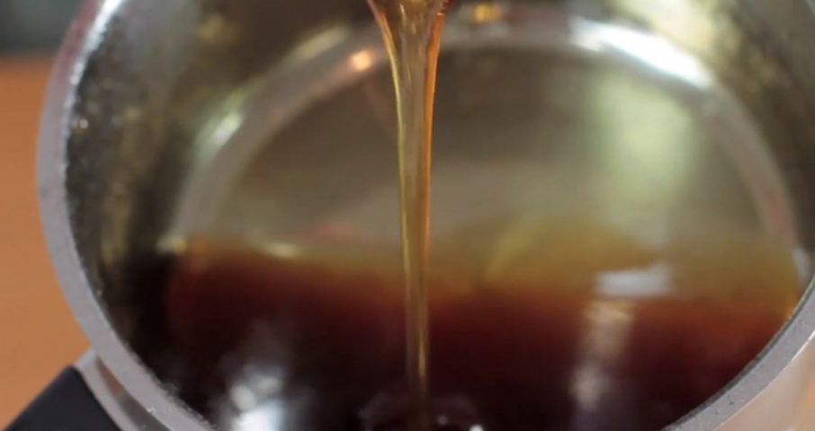 Затем отставьте кастрюлю в сторону, чтобы немного охладить ее. Сахар должен быть карамелизирован, что придаёт веществу густую липкую консистенцию.