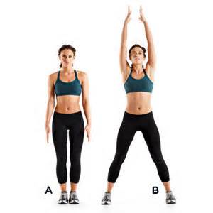 Ноги на ширине плеч, руки вдоль тела. Подпрыгните вверх и разведите ноги в стороны, поднимая руки над головой.