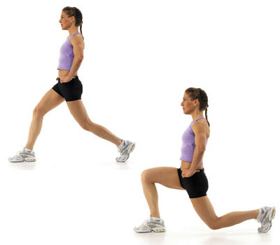 Ноги на ширине плеч, руки на поясе. Левой ногой широкий шаг вперед, затем присед, практически касаясь правым коленом пола. Оттолкнитесь левой ногой и вернитесь в исходное положение. Повторите для правой ноги. - Прыжки