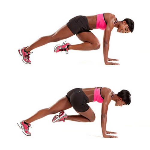 Стоя в планке, правое колено подтяните к правому локтю, затем вернитесь в исходное положение и поднесите левое колено к левому локтю. Выполняйте в быстром темпе. - Выпады